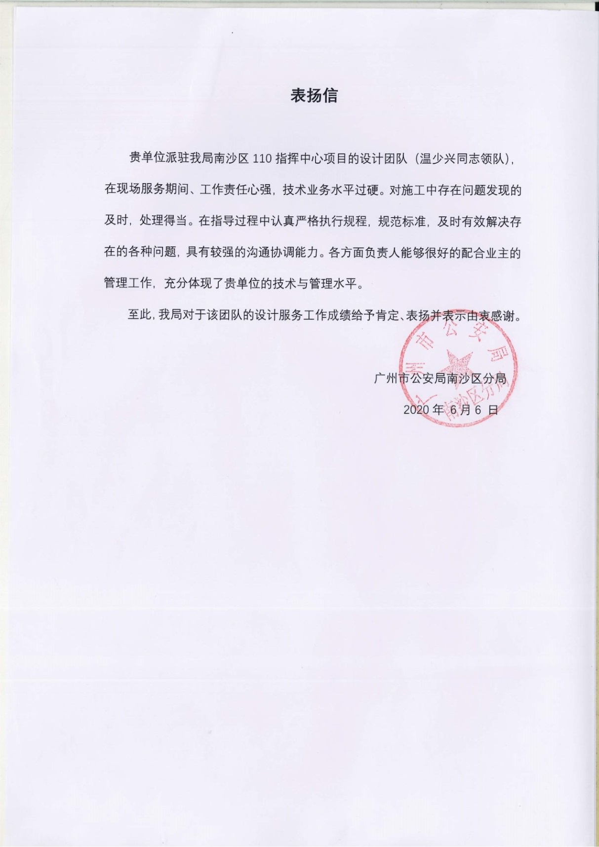 近日,廣州市公安局南沙區(qū)分局送來表揚(yáng)信,對我公司廣州市南沙公安分局110指揮中心裝修設(shè)計(jì)工程的設(shè)計(jì)團(tuán)隊(duì)給予表揚(yáng)。
