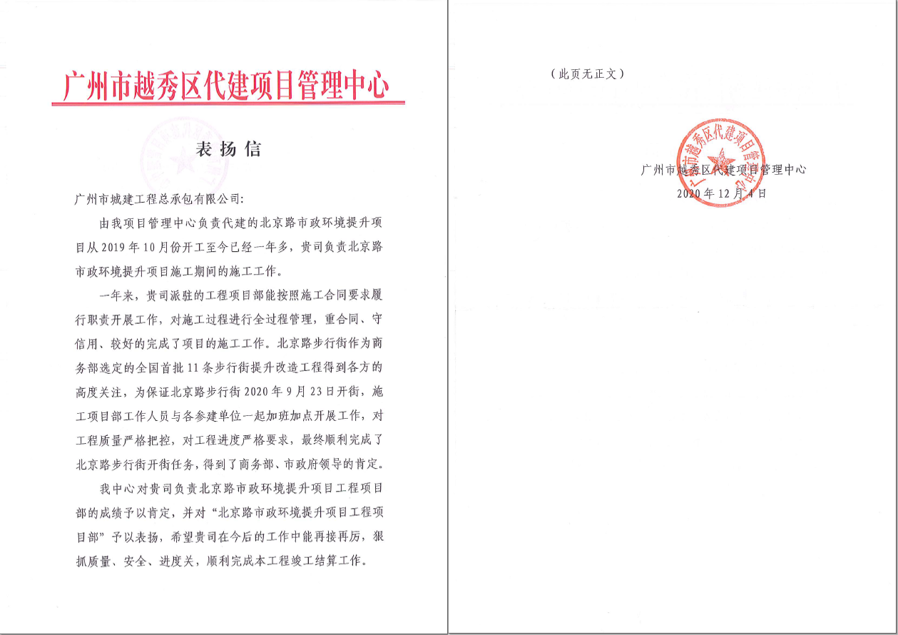 12月7日,廣州市越秀區代建項目管理中心向我公司發來表揚信,對我公司負責的北京路步行街改造提升項目的施工工作予以肯定和表揚。