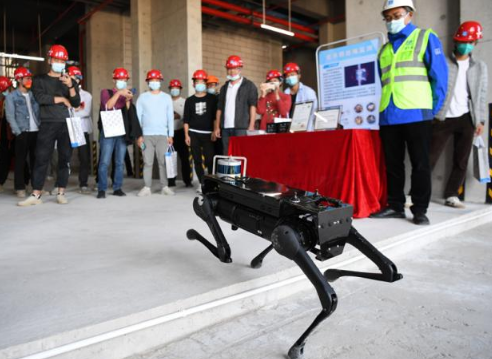 觀摩現(xiàn)場一只好動的巡檢機器狗在跳來跳去,它能夠代替人工到施工現(xiàn)場進行工地巡檢,分析危險源,識別火焰、煙霧、人員未佩戴安全帽、未穿反光背心等情況,極大提高危險作業(yè)區(qū)域巡視管理效率及安全性;抹灰機器人通過高效振動和液壓提升,將砂漿平整的涂抹在墻面,解決高空作業(yè)及抹灰效能問題……