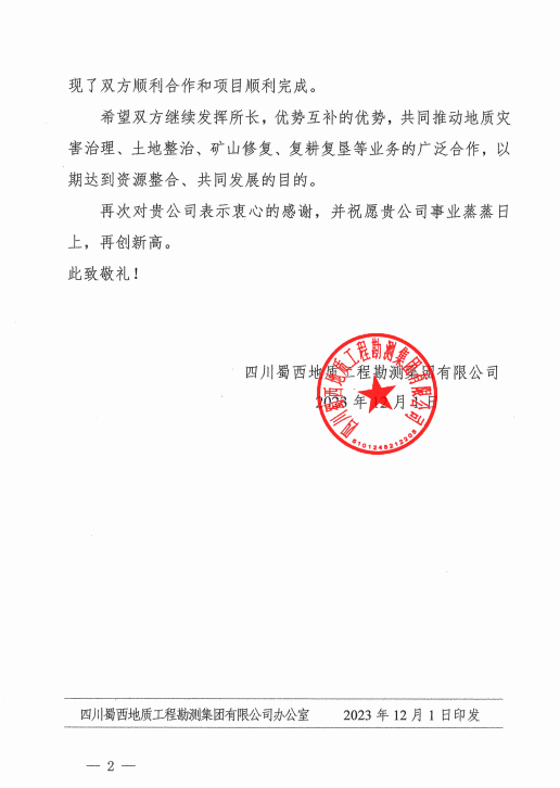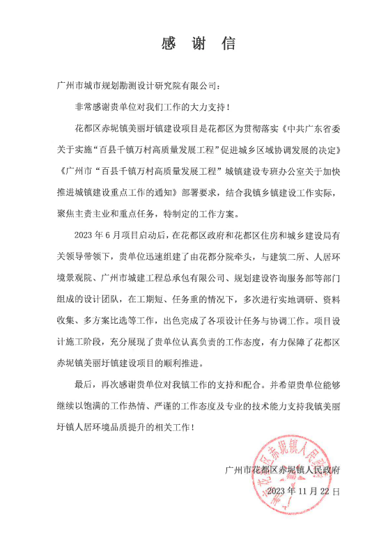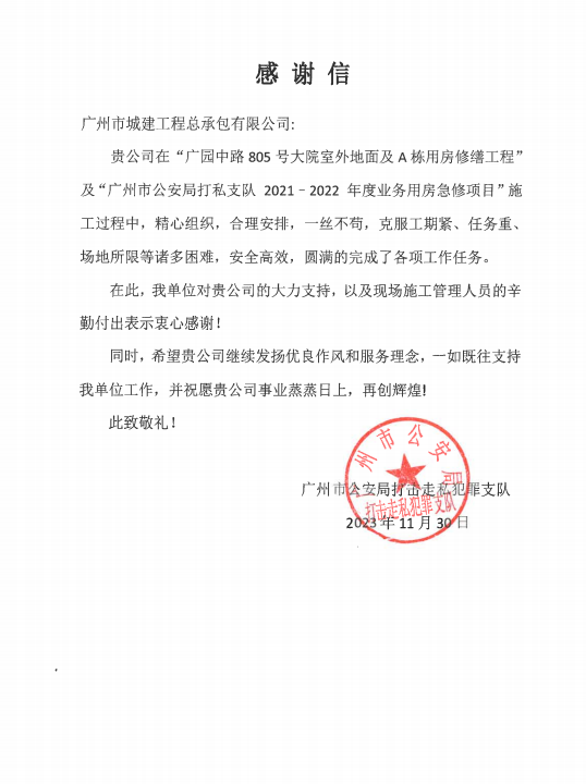 近期,公司陸續(xù)收到多個項目業(yè)主和配合單位發(fā)來的感謝信,黃埔區(qū)文沖街道辦-瑞東花園社區(qū)品質提升項目、十六中學-校本部飯?zhí)酶脑祉椖俊⒒ǘ汲噗桄?zhèn)政府-美麗圩鎮(zhèn)全過程咨詢項目、廣州市公安局打私隊-廣園中路805號大院室外地面及A棟用房修繕工程、廣州市公安局打私支隊2021-2022年度業(yè)務用房急修項目、四川蜀西地勘集團-肇慶歷史遺留礦山生態(tài)修復工程等參建單位對公司和項目參與成員所付出的工作表示肯定和感謝。對公司的項目團隊發(fā)揮不怕疲勞、持續(xù)作戰(zhàn)的職業(yè)精神,在高強度駐場工作中表現(xiàn)出的高度工作熱情、強烈工作責任心、扎實專業(yè)素養(yǎng)和嚴謹細致的工作態(tài)度給予贊揚。