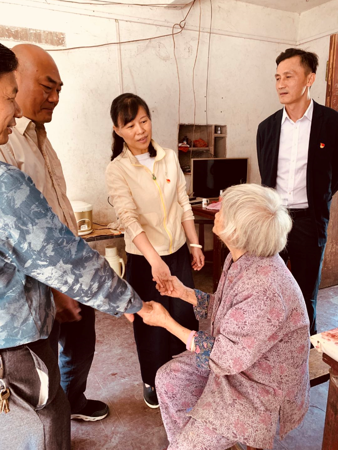 萬錦英老人家中有三口人,其 53歲的兒子在外打工的同時要照顧視力一級殘疾的孫子,所以老人在黎塘村老屋的家中常常是一個人居住,平時飲食起居全靠老人自己。蔡慶立同志駐村后經常關心老人的身體生活狀況,噓寒問暖,甚至為老人量腳上網購買合適的鞋;老人屋后出入的木橋破舊,存在安全隱患,駐村工作隊為老人籌資修建了結實的鐵板橋和護欄。老人拉著前來探望她的陳蓉書記,眼含熱淚,對幫扶單位和駐村工作隊一再表示感謝。老人腰腿不好,我們離開時鎖好她家后門不讓她送,她堅持走出二樓門外,站在新修的鐵橋邊,依依不舍目送我們離開……