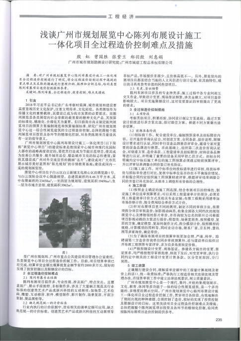 公司對廣州市規劃展覽中心陳列布展設計施工一體化項目全過程造價控制進行了研究,將全過程造價控制過程中遇到的重點難點及采取的措施進行整理歸納、梳理和分析總結,給同類型陳列布展項目造價控制提供參考。